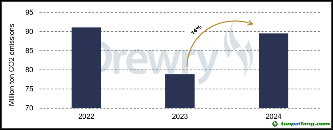 Drewry稱,2024年航運業(yè)在歐盟排放交易體系(EU ETS)范圍內(nèi)的二氧化碳排放量約為9000萬噸,比上一年增長了約14%。 內(nèi)-容-來-自;中_國_碳_0排放¥交-易=網(wǎng) t an pa i fa ng . c om