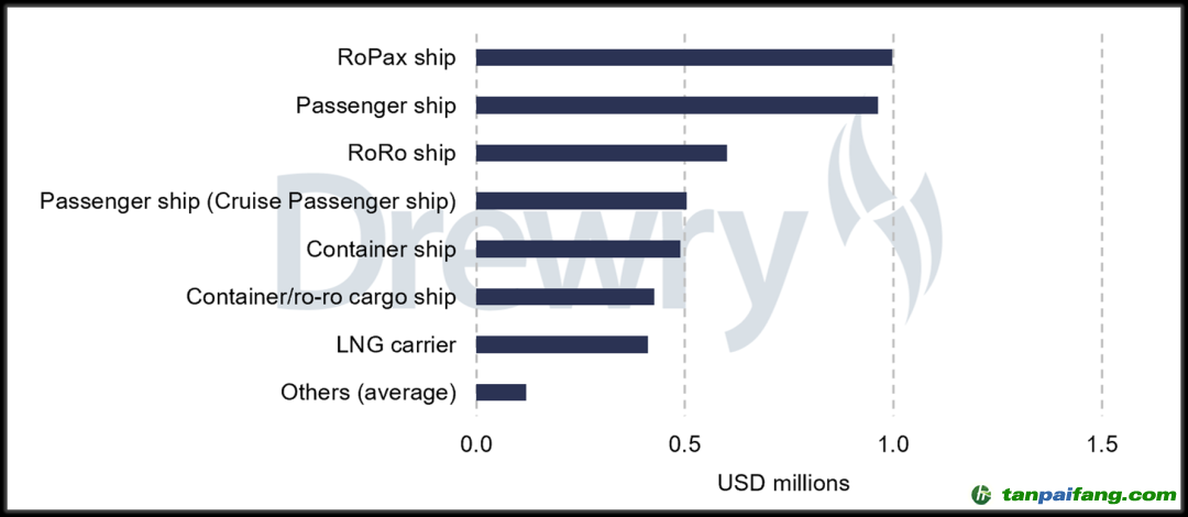平均到每艘船舶,以2024年第一年的付費水平,每艘客滾船(RoPax)或純客船將平均向歐盟 ETS 支付約100萬美元,而一艘集裝箱船將平均支付約50萬美元。