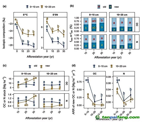 在此階段,δ13C 和 δ1?N值下降最快,表層土壤(0–10 cm)的大團(tuán)聚體成為新有機(jī)碳和氮積累的“熱點(diǎn)區(qū)域”,表現(xiàn)出最高的積累速率。隨著林齡增長,新輸入的有機(jī)碳和氮儲量持續(xù)增加,而原有組分相對穩(wěn)定。新有機(jī)碳和氮的積累速率在造林十年時(shí)達(dá)到峰值,之后顯著下降,表明土壤碳固持能力隨造林時(shí)間延長逐漸趨于飽和。