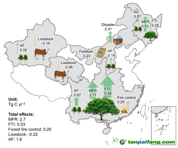 將生態(tài)系統(tǒng)管理影響(兩個模型殘差)明顯變化的省份劃分為5個區(qū)域,進(jìn)一步發(fā)現(xiàn):在各種森林管理措施中,森林撫育投資和封山育林是驅(qū)動碳匯增長最關(guān)鍵的兩項(xiàng)措施。森林撫育投資和封山育林分別貢獻(xiàn)了5.53 Tg C yr–2和2.7 Tg C yr–2的NEP增長。它們的作用在中國南方林區(qū)最明顯(5.28和2.17 Tg C yr–2),而火災(zāi)面積的下降也有輕微正效應(yīng)。在東北林區(qū),封山育林的影響則高于森林撫育投資。在北方草地區(qū),旱災(zāi)面積的下降緩解了殘差的負(fù)效應(yīng)。在高寒草地區(qū)和干旱草地區(qū),牲畜量增加導(dǎo)致管理的正效應(yīng)在下降。此外,2010年后人為NEP的加速與森林撫育投資的加強(qiáng)和火災(zāi)面積的急劇下降密切相關(guān)。 本/文-內(nèi)/容/來/自:中-國-碳-排-放-網(wǎng)-tan pai fang . com