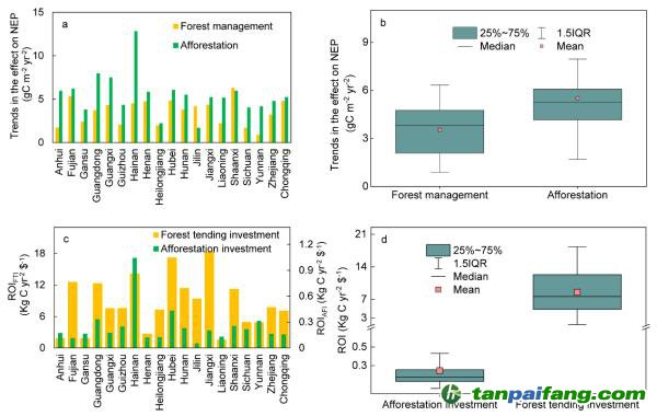 研究團(tuán)隊(duì)還對比了造林(主要LUCC類型)與森林撫育(主要管理類型)的成本效益。雖然單位面積造林帶來的增匯(5.51 g C m–2 yr–2)高于森林管理(3.54 g C m–2 yr–2),但在考慮投資成本后,森林撫育的投資回報率(ROI,即NEP增益與投資之比)在所有省份均遠(yuǎn)高于造林,平均投資回報率的差異達(dá)30多倍:8.54 kg C yr–2 $–1 VS 0.25 kg C yr–2 $–1。這表明,在適宜造林土地有限的背景下,加強(qiáng)對現(xiàn)有森林的可持續(xù)經(jīng)營與管理,是未來提升國家陸地碳匯能力更具成本效益的策略。 本+文`內(nèi).容.來.自:中`國`碳`排*放*交*易^網(wǎng) t a np ai fan g.com