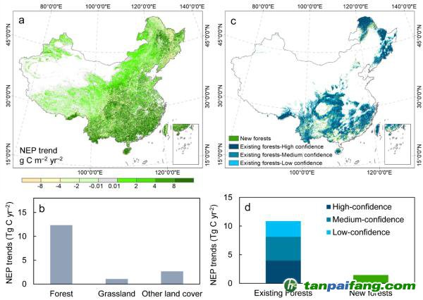 結(jié)果表明,2001–2021年中國年均NEP為327 Tg C yr–1,且以16.1 Tg C yr–2的速率顯著增長。NEP增長最快的區(qū)域位于南方地區(qū)和黃土高原東南部。森林貢獻(xiàn)了總增匯的77%。其中,現(xiàn)有森林面積廣闊(約177–223萬km2),其碳匯增長趨勢(8.1–10.9 Tg C yr–2)遠(yuǎn)大于新森林(34萬km2,增長趨勢1.5 Tg C yr–2)。