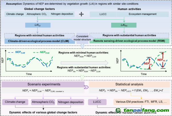 圖1. 基于結(jié)構(gòu)一致的遙感和氣候驅(qū)動的過程模型估算人類活動對碳匯影響的框架 內(nèi)-容-來-自;中_國_碳_0排放¥交-易=網(wǎng) t an pa i fa ng . c om