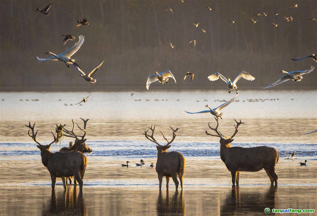 11月26日,石首麋鹿國家級(jí)自然保護(hù)區(qū),一群小天鵝從麋鹿群旁飛過。隨著保護(hù)區(qū)生態(tài)環(huán)境日益向好,越來越多的珍稀鳥類來保護(hù)區(qū)越冬。(湖北日報(bào)全媒記者 柯皓 通訊員 楊濤 攝) 本`文@內(nèi)-容-來-自;中^國_碳0排0放^交-易=網(wǎng) ta n pa i fa ng . co m
