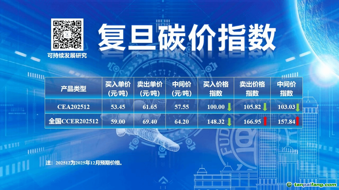 2025年11月29日,復(fù)旦大學(xué)可持續(xù)發(fā)展研究中心公布了2025年12月復(fù)旦碳價(jià)指數(shù)結(jié)果。 本/文-內(nèi)/容/來(lái)/自:中-國(guó)-碳-排-放-網(wǎng)-tan pai fang . com