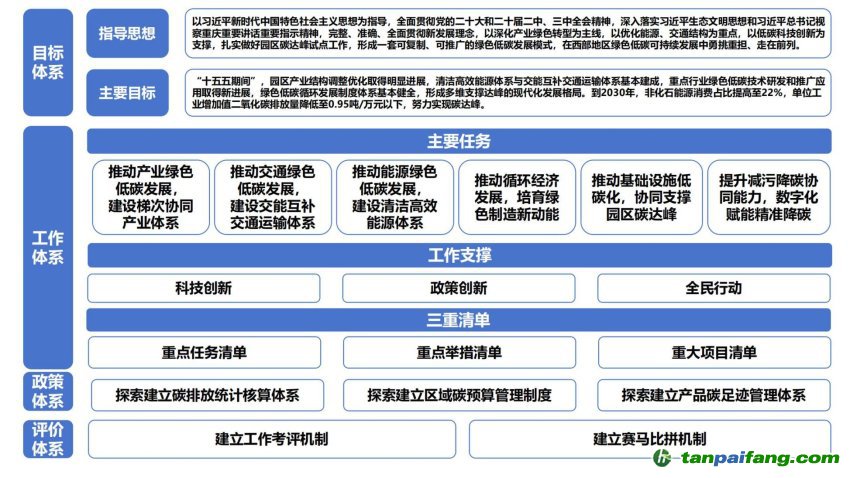 以習(xí)近平新時代中國特色社會主義思想為指導(dǎo),全面貫徹黨的二十大和二十屆二中、三中、四中全會精神,深入落實習(xí)近平生態(tài)文明思想和習(xí)近平總書記視察重慶重要講話重要指示精神,完整準(zhǔn)確全面貫徹新發(fā)展理念,以深化產(chǎn)業(yè)綠色轉(zhuǎn)型為主線,以優(yōu)化能源、交通結(jié)構(gòu)為重點,以低碳科技創(chuàng)新為支撐,扎實做好園區(qū)碳達峰試點工作。“十五五”期間,園區(qū)產(chǎn)業(yè)結(jié)構(gòu)調(diào)整優(yōu)化取得明顯進展,清潔高效能源體系與交能互補交通運輸體系基本建成,重點行業(yè)綠色低碳技術(shù)研發(fā)和推廣應(yīng)用取得新進展,綠色低碳循環(huán)發(fā)展體系基本健全,形成多維支撐達峰的現(xiàn)代化發(fā)展格局。到2030年,非化石能源消費占比提高至22%,單位工業(yè)增加值二氧化碳排放量降低至0.95噸/萬元以下,努力實現(xiàn)碳達峰。 本`文內(nèi).容.來.自:中`國`碳`排*放*交*易^網(wǎng) t a npai fan g.com