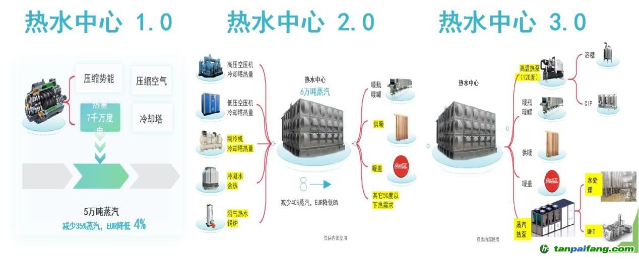 據(jù)介紹,該系統(tǒng)實(shí)施分三步走:首先回收工業(yè)高溫余熱,提高能源利用率;其次利用高溫工業(yè)熱泵提升余熱至高溫?zé)崴蛲瑫r(shí)供應(yīng)工藝?yán)渌透邷責(zé)崴?;最后通過(guò)超高溫蒸汽熱泵制備100℃~170℃蒸汽,形成電力驅(qū)動(dòng)的冷熱汽耦合供能體系。目前,該系統(tǒng)已在啤酒加工、工業(yè)飲料等行業(yè)構(gòu)建典型