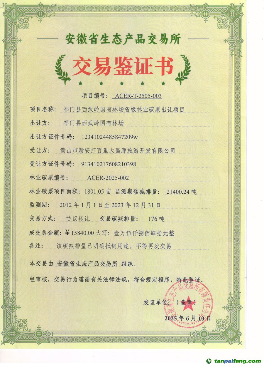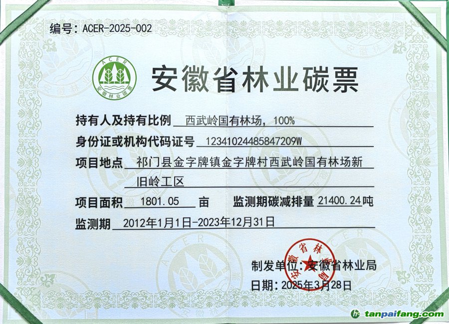 黃山市祁門(mén)縣西武嶺國(guó)有林場(chǎng)的林業(yè)碳票。 受訪者供圖 內(nèi)/容/來(lái)/自:中-國(guó)-碳-排-放*交…易-網(wǎng)-tan pai fang . com