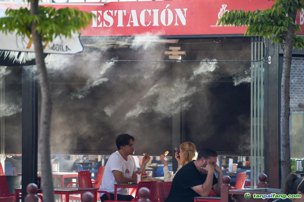 2025年9月17日,在西班牙馬德里,顧客在水霧裝置附近用餐。新華社發(fā)(古斯塔沃·巴連特攝)