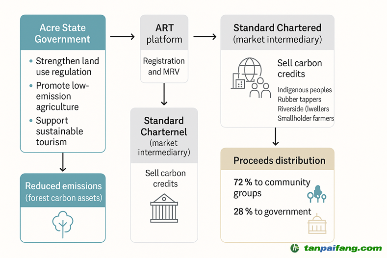 碳中和目標(biāo)的跨國(guó)企業(yè)和機(jī)構(gòu)買(mǎi)家,使森林保護(hù)成果真正進(jìn)入市場(chǎng)流通。最后,交易所得將按照協(xié)議規(guī)定進(jìn)行分配,其中72% 的收益直接返還給社區(qū)群體,包括原住民、橡膠工、河岸居民和家庭農(nóng)業(yè)家庭,用于低排放畜牧業(yè)、次生林復(fù)林、免砍伐清地、社區(qū)旅游以及應(yīng)對(duì)洪水、干旱等極端氣候事件。28% 的收益則用于提升地方政府治理能力,特別是在森林監(jiān)管、第三方核查以及設(shè)立應(yīng)對(duì)極端氣候事件的專(zhuān)項(xiàng)應(yīng)急資金。